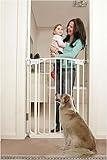 I was desperate to find a gate that could contain my 120 pound Great Pyrenees and found it in the Bindaboo extra tall gate. He can stand up against the gate and cannot push it over (he's a really big boy). It's tall enough and strong enough to contain him. We did screw the cups into the wall and you do need longer screws than what is provided. Other than needing bigger screws it's a great investment. As I said I was desperate to contain him as he was getting very destructive and this gate solved my problem!Get more detail about Bindaboo Extra Tall Swing Metal Gate 39.4" H WHITE (B1121).